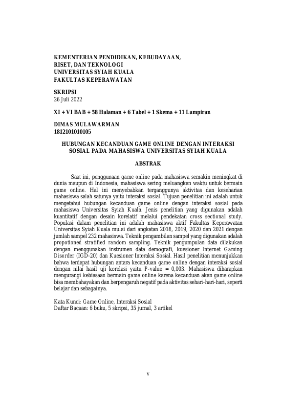 DIMAS MULAWARMAN, HUBUNGAN KECANDUAN GAME ONLINE DENGAN INTERAKSI SOSIAL PADA MAHASISWARNUNIVERSITAS SYIAH KUALA. Banda Aceh Fakultas Keperawatan,2022
