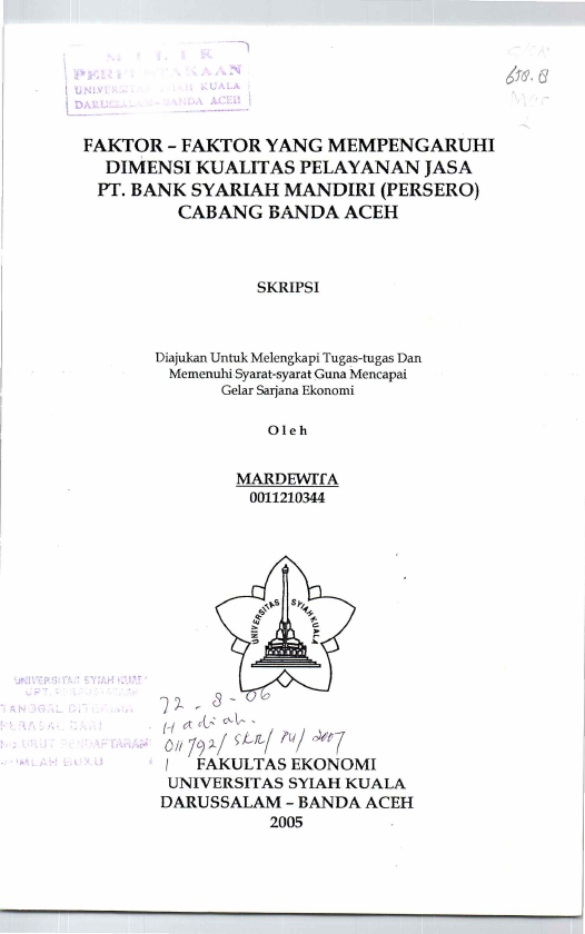 Mardewita, FAKTOR - FAKTOR YANG MEMPENGARUHI DIMENSI KUALITAS PELAYANAN JASA PT. BANK SYARIAH MANDIRI (PERSERO) CABANG BANDA ACEH. Banda Aceh Fakultas Ekonomi,