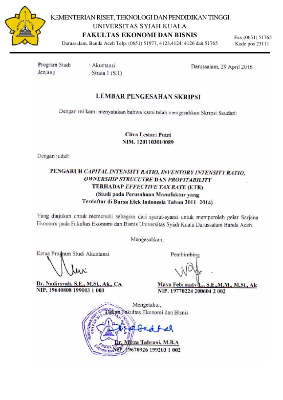 CITRA LESTARI PUTRI, PENGARUH CAPITAL INTENSITY RATIO, INVENTORY INTENSITY RATIO, OWNERSHIP STRUCTURE, DAN PROFITABILITY TERHADAP EFFECTIVE TAX RATE (ETR) PADA PERUSAHAAN MANUFAKTUR YANG TERDAFTAR DI BURSA EFEK INDONESIA TAHUN 2011-2014. Banda Aceh Universitas Syiah Kuala,2016