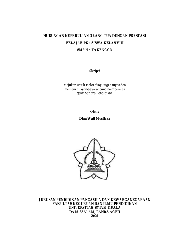 DINA WATI MUSFIRAH, HUBUNGAN KEPEDULIAN ORANG TUA DENGAN PRESTASI BELAJAR PKN SISWA KELAS VIII SMP N 4 TAKENGON. Banda Aceh Universitas Syiah Kuala,2021