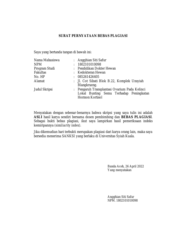 ANGGHIAN SITI SAFUR, PENGARUH TRANSPLANTASI OVARIUM PADA KELINCI LOKAL BUNTING SEMU TERHADAP PENINGKATAN HORMON KORTISOL. Banda Aceh Fakultas Kedokteran Hewan,2022