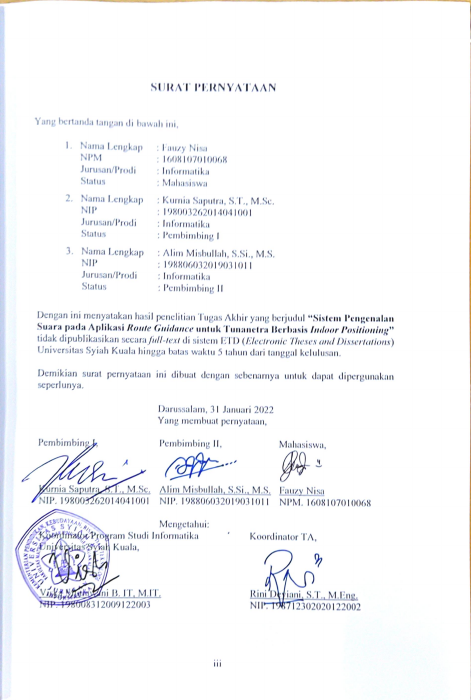 FAUZY NISA, SISTEM PENGENALAN SUARA PADA APLIKASI ROUTE GUIDANCE UNTUK TUNANETRA BERBASIS INDOOR POSITIONING. Banda Aceh Fakultas MIPA (S1),2022