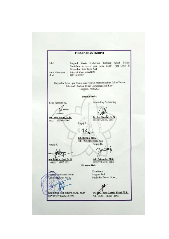 FATHONAH KHOIRUNNISA DLM, PENGARUH WAKTU PEMBAKARAN TERHADAP JUMLAH BAKTERI STAPHYLOCOCCUS AUREUS PADA BAKSO BAKAR YANG DIJUAL DI DARUSSALAM, KOTA BANDA ACEH. Banda Aceh Fakultas Kedokteran Hewan,2022