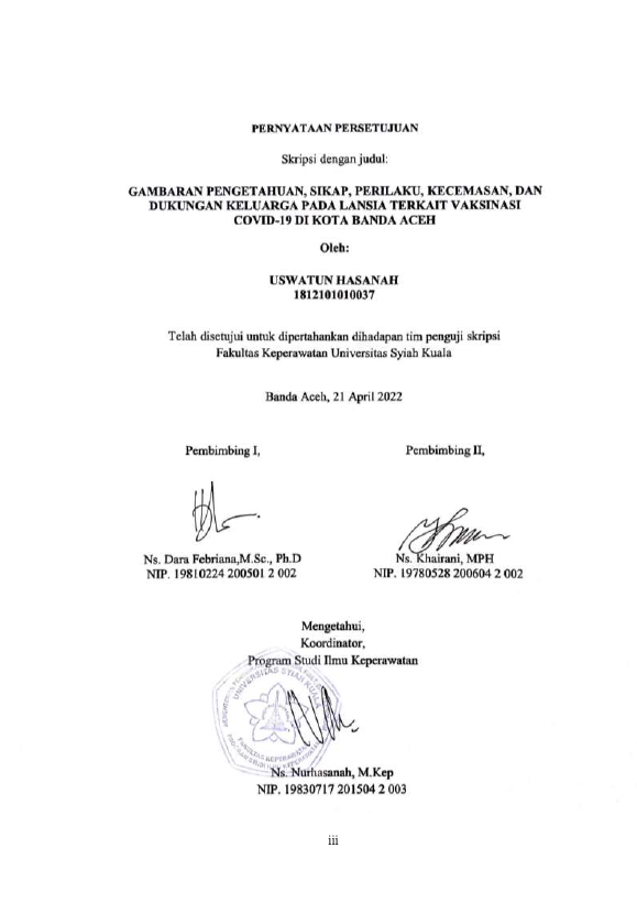 Uswatun Hasanah, GAMBARAN PENGETAHUAN, SIKAP, PERILAKU, KECEMASAN DAN DUKUNGAN KELUARGA PADA LANSIA TERKAIT VAKSINASI COVID-19 DI KOTA BANDA ACEH. Banda Aceh Fakultas Keperawatan (S1),2022