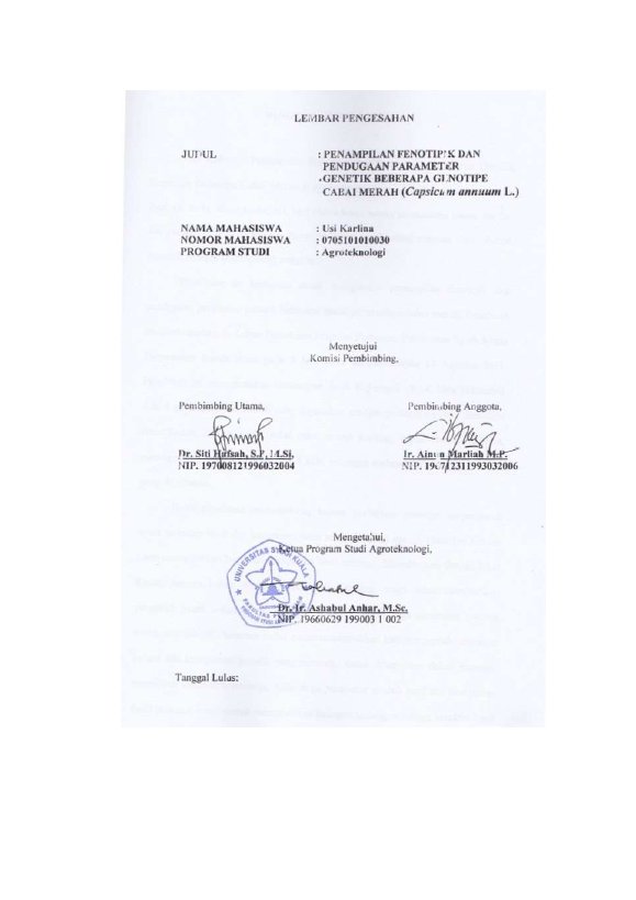 Usi karlina, PENAMPILAN FENOTIPIK DAN PENDUGAAN PARAMETER GENETIK BEBERAPA GENOTIPE CABAI MERAH (CAPSICUM ANNUUM L.). Banda Aceh Fakultas Pertanian,2014