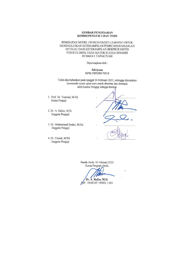 Selviyana, PENERAPAN MODEL PROBLEM BASED LEARNING UNTUK MENINGKATKAN KETERAMPILAN PEMECAHAN MASALAH DITINJAU DARI KETERAMPILAN BERPIKIR KRITIS PESERTA DIDIK PADA MATERI FLUIDA DINAMIS DI SMAN 1 TAPAKTUAN. Banda Aceh Fakultas Pasca Sarjana,2022