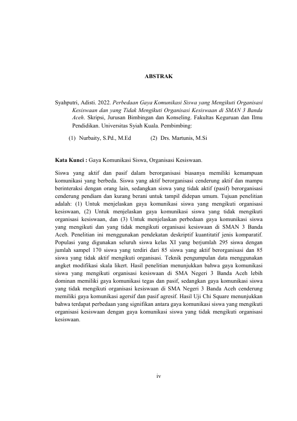 ADISTI SYAHPUTRI, PERBEDAAN GAYA KOMUNIKASI ANTARA SISWA YANG MENGIKUTIRNORGANISASI KESISWAAN DAN YANG TIDAK MENGIKUTI ORGANISASIRNKESISWAAN DI SMAN 3 BANDA ACEH. Banda Aceh Fakultas KIP,2022