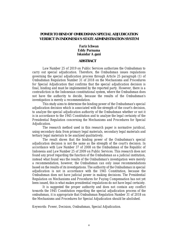 Fariz Ichwan, KEKUATAN MENGIKAT PUTUSAN AJUDIKASI KHUSUS OMBUDSMAN DALAM SISTEM KETATANEGARAAN INDONESIA. Banda Aceh Fakultas Hukum (S2),2022