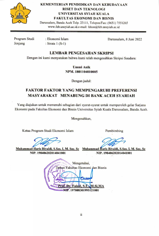Baca Juga : ANALISIS PREFERENSI MASYARAKAT TERHADAP PRINSIP BAGI HASIL PADA BANK SYARIAH DI WILAYAH BANDA ACEH (Vebitia, 2017)