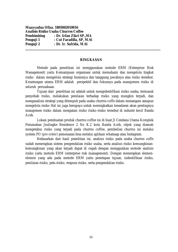 Muayyadna Ofiza, ANALISIS RISIKO USAHA CHURROS COFFEE. Banda Aceh Fakultas Pertanian (D3),2022