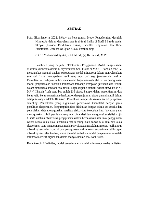 Elva Sesioria Putri, EFEKTIVITAS PENGGUNAAN MODEL PENYELESAIAN MASALAH MINNESOTA DALAM MENYELESAIKAN SOAL-SOAL FISIKA DI MAN 1 BANDA ACEH. Banda Aceh Fakultas KIP,2022