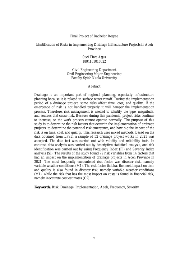 Suci Tiara Agus, IDENTIFIKASI RISIKO PADA PELAKSANAAN PROYEK INFRASTRUKTUR DRAINASE DI PROVINSI ACEH. Banda Aceh Fakultas Teknik,2022