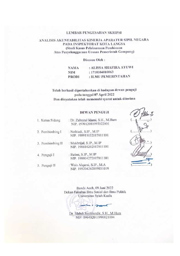 ALISSA SHAFIRA AYUWI, ANALISIS AKUNTABILITAS KINERJA APARATUR SIPIL RNNEGARA PADA INSPEKTORAT KOTA LANGSARN(STUDI KASUS PELAKSANAAN PEMBINAAN ATAS RNPENYELENGGARAAN URUSAN PEMERINTAH GAMPONG). Banda Aceh Fakultas Ilmu Sosial dan ilmu Politik,2022