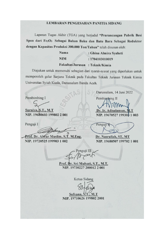 CUT NAJLA FATIN, PRARANCANGAN PABRIK BESI SPON DARI FE2O3 SEBAGAI BAHAN BAKU DAN BATU BARA SEBAGAI REDUKTOR DENGAN KAPASITAS PRODUKSI 300.000 TON/TAHUN. Banda Aceh Fakultas Teknik,2022