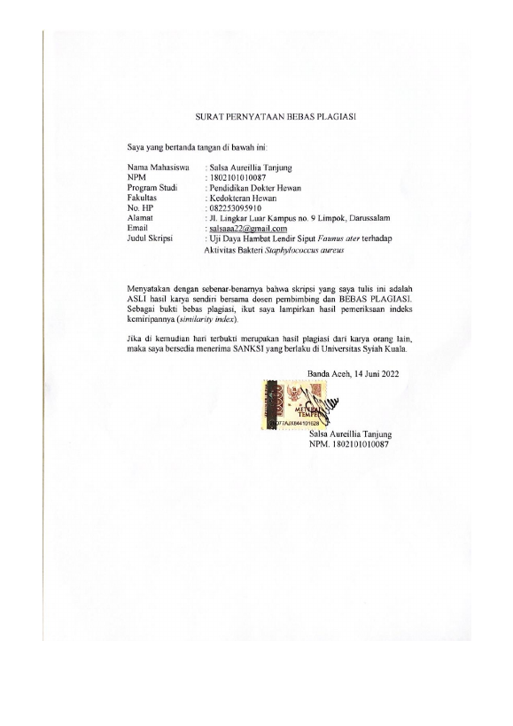 SALSA AUREILLIA TANJUNG, UJI DAYA HAMBAT LENDIR SIPUT FAUNUS ATER TERHADAP AKTIVITAS BAKTERI STAPHYLOCOCCUS AUREUS. Banda Aceh Fakultas Kedokteran Hewan,2022
