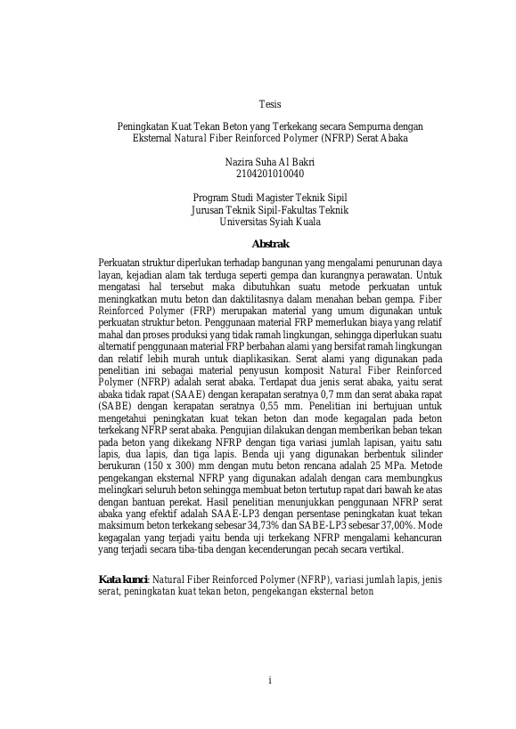 Baca Juga : PENINGKATAN KUAT TEKAN BETON YANG TERKEKANG SECARA SEMPURNA DENGAN EKSTERNAL NATURAL FIBER REINFORCED POLYMER (NFRP) SERAT ABAKA (Nazira Suha Al Bakri, 2022)