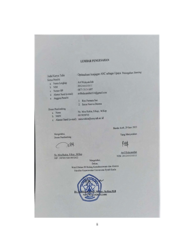 Arif Hidayatullah, OPTIMALISASI KUNJUNGAN ANC SEBAGAI UPAYA PENCEGAHAN STUNTING. Banda Aceh Fakultas Keperawatan,2022