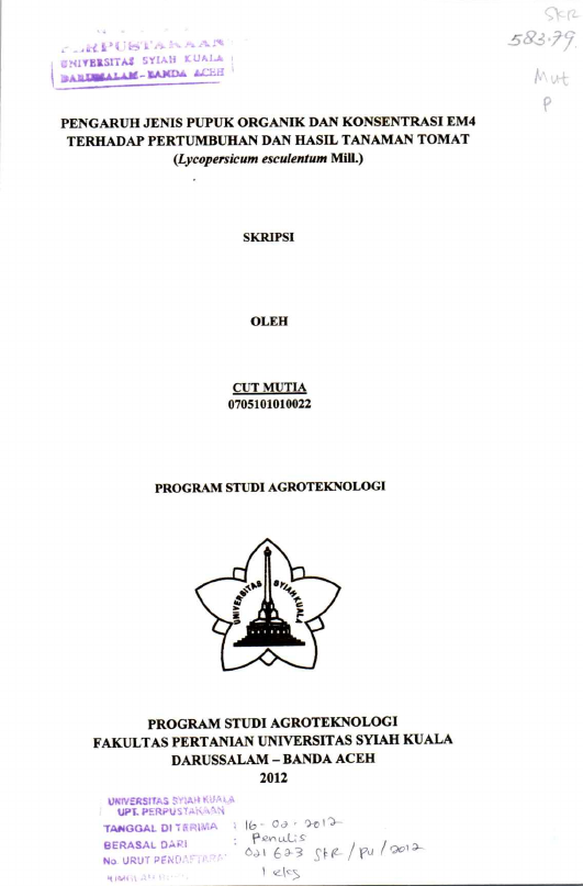 Cut Mutia, PENGARUH JENIS PUPUK ORGANIK DAN KONSENTRASI EM4 TERHADAP PERTUMBUHAN DAN HASIL TANAMAN TOMAT (LYCOPERSICUM ESCULENTUM MILL.). Banda Aceh Fakultas Pertanian,2012