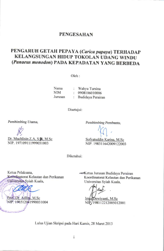 Wahyu Tursina, PENGARUH GETAH PEPAYA (CARICAPAPAYA) TERHADAP KELANGSUNGAN HIDUP TOKOLAN UDANG WINDU (PANAEUS MONODON) PADA KEPADATAN YANG BERBEDA. Banda Aceh Fakultas Kelautan dan perikanan,2013
