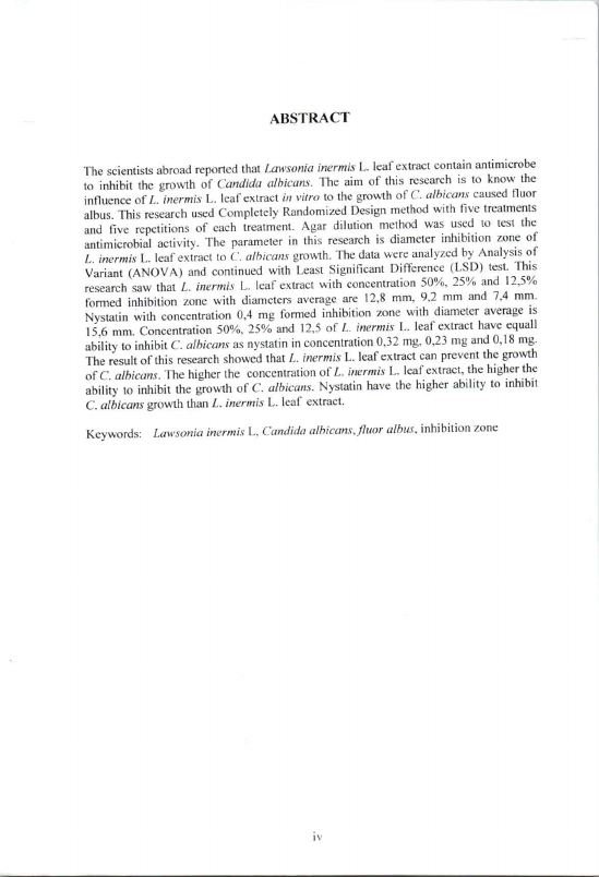 Rima Ristianti, PENGARUH PEMBERIAN EKSTRAKRNDAUN PACAR KUKU (LAWSONIA INERMIS L.) TERHADAP PERTUMBUHAN JAMUR CANDIDA ALBICANS PENYEBAB KEPUTIHAN (FLUOR ALBUS) SECARA IN VITRO. Banda Aceh Fakultas Matematika dan Ilmu Pengetahuan Alam,2007
