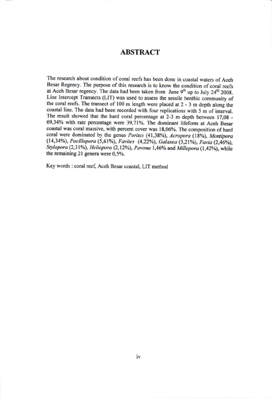 Muhammad Arrafi, KONDISI TERUMBU KARANG DI PERAIRAN PESISIR ACEH BESAR. Banda Aceh Fakultas Matematika dan Ilmu Pengetahuan Alam,2008