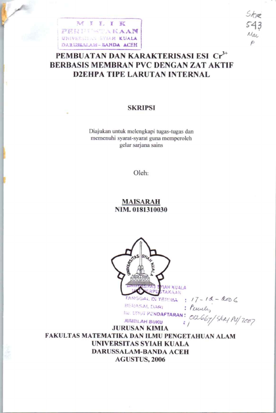 Baca Juga : PEMBUATAN DAN KARAKTERISASI ESI CR3+ BERBASIS MEMBRAN PVC DENGAN ZAT AKTIF D2EHPA TIPE LA RUTAN INTERNAL (Maisarah, 2022)