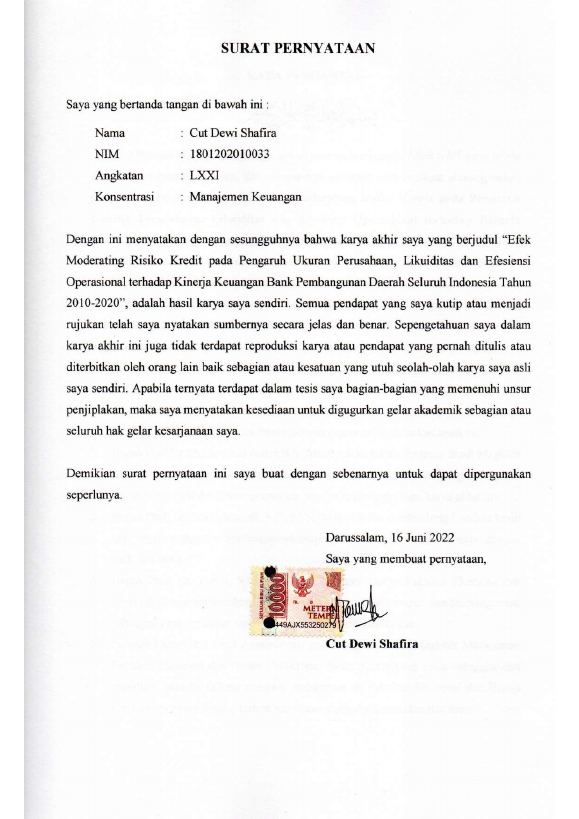 Cut Dewi Shafira, EFEK MODERATING RISIKO KREDIT PADA PENGARUH UKURAN PERUSAHAAN, LIKUIDITAS DAN EFESIENSI OPERASIONAL TERHADAP KINERJA KEUANGAN BANK PEMBANGUNAN DAERAH SELURUH INDONESIA TAHUN 2010-2020. Banda Aceh Fakultas Ekonomi dan Bisnis (S2),2022