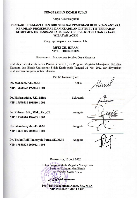 Rifki Zil Ikram, PENGARUH PEMANTAUAN DIRI SEBAGAI PEMEDIASI HUBUNGAN ANTARA KEADILAN PROSEDURAL DAN KEADILAN DISTRIBUTIF TERHADAP KOMITMEN ORGANISASI PADA KANTOR BPJSRN KETENAGAKERJAAN WILAYAH ACEH. Banda Aceh Fakultas Ekonomi dan Bisnis (S2),2022