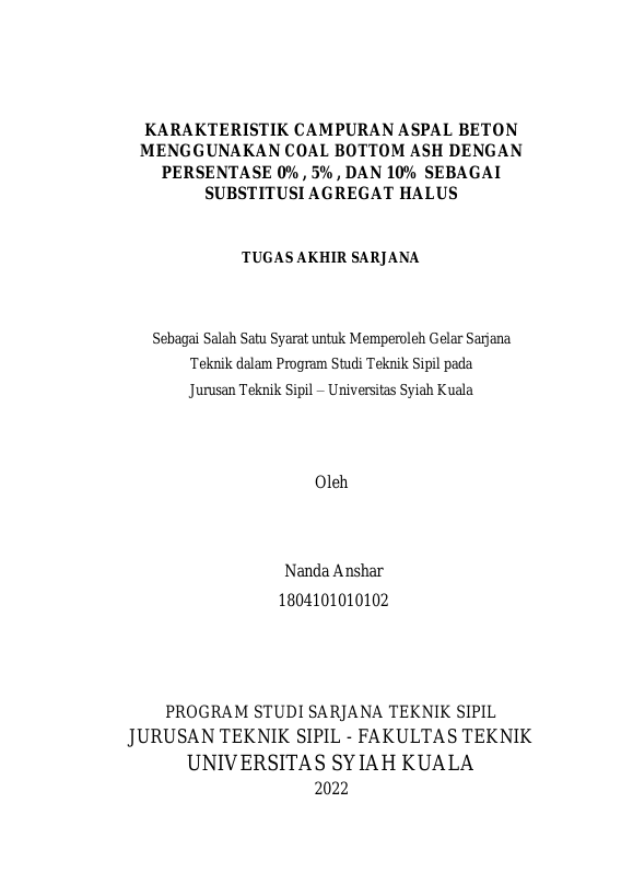Baca Juga : KARAKTERISTIK CAMPURAN ASPAL BETON MENGGUNAKAN COAL BOTTOM ASH DENGAN PERSENTASE 0%, 5%, DAN 10% SEBAGAI SUBSTITUSI AGREGAT HALUS (NANDA ANSHAR, 2022)