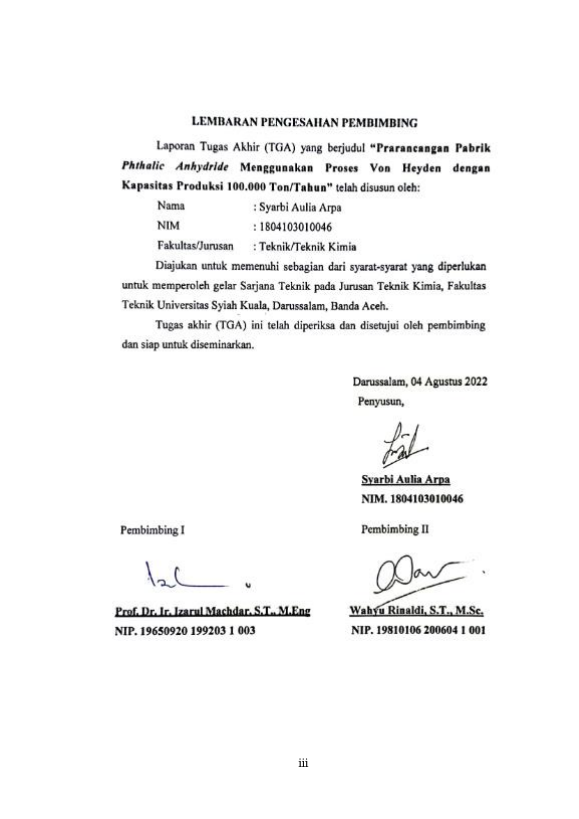 SYARBI AULIA ARPA, PRARANCANGAN PABRIK PHTHALIC ANHYDRIDE MENGGUNAKAN PROSES VON HEYDEN DENGAN KAPASITAS PRODUKSI 100.000 TON/TAHUN. Banda Aceh Fakultas Teknik Univesitas Syiah Kuala,2022