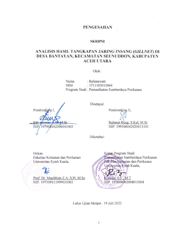 RAHMAWATI, ANALISIS HASIL TANGKAPAN JARING INSANG (GILLNET) DI DESA BANTAYAN, KECAMATAN SEUNUDDON, KABUPATEN ACEH UTARA. Banda Aceh Fakultas Kelautan dan perikanan,2022