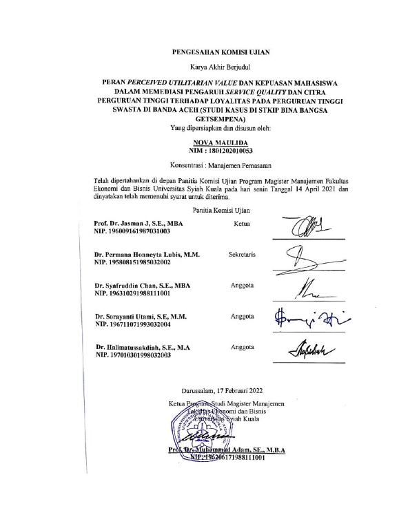 Nova Maulida, PERAN PERCEIVED UTILITARIAN VALUE DAN KEPUASAN MAHASISWA DALAM MEMEDIASI PENGARUH SERVICE QUALITY DAN CITRA PERGURUAN TINGGI TERHADAP LOYALITAS PADA PERGURUAN TINGGI SWASTA DI BANDA ACEH (STUDI KASUS DI STKIP BINA BANGSA GETSEMPENA). Banda Aceh Program Studi Magister Manajemen,2022