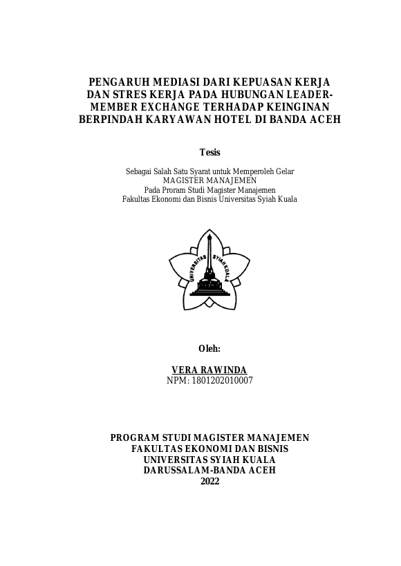 Vera Rawinda, PENGARUH MEDIASI DARI KEPUASAN KERJA DAN STRES KERJA PADA HUBUNGAN LEADER- MEMBER EXCHANGE TERHADAP KEINGINAN BERPINDAH KARYAWAN HOTEL DI BANDA ACEH. Banda Aceh Program Studi Magister Manajemen,2022