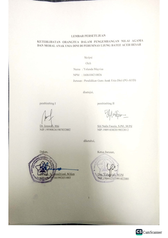 YOLANDA MAYRISA, KETERLIBATAN ORANG TUA DALAM PENGEMBANGAN NILAI AGAMA MORAL ANAK USIA DINI DI PERUMNAS UJUNG BATEE ACEH BESAR. Banda Aceh Fakultas KIP,2022