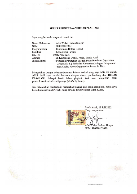 Baca Juga : PENGARUH EKSTRAK METANOL TEMU IRENG (CURCUMA AERUGINOSA ROXB.) TERHADAP FASCIOLA GIGANTICA SECARA IN VITRO (RIZKI PARINDRA, 2019)