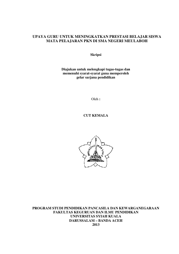 Cut Kemala, UPAYA GURU UNTUK MENINGKATKAN PRESTASI BELAJAR SISWA MATA PELAJARAN PKN DI SMA NEGERI MEULABOH. Banda Aceh Fakultas Keguruan dan Ilmu Pendidikan,2013