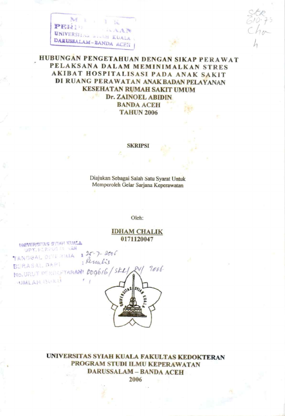 Idham Chalik, HUBUNGAN PENGETAHUAN DENGAN SIKAP PERAWAT PELAKSANA DALAM MEMINIMALKAN STRES AKIBAT HOSPITALISASI PADA ANAK SAKIT DI RUANG PERAWATAN ANAK BADAN PELAYANANRNKESEHATAN RUMAH SAKIT UMUM DR. ZALNOEL ABIDIN BANDA ACEH TAHUN 2006. Banda Aceh Fakultas Kedokteran,2006