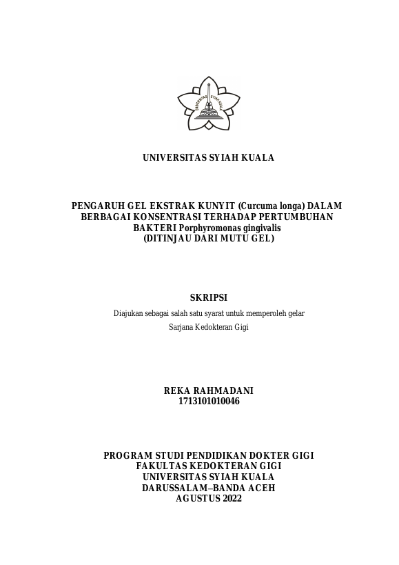 REKA RAHMADANI, PENGARUH GEL EKSTRAK KUNYIT (CURCUMA LONGA) DALAM BERBAGAI KONSENTRASI TERHADAP PERTUMBUHAN BAKTERI PORPHYROMONAS GINGIVALIS (DITINJAU DARI MUTU GEL). Banda Aceh Fakultas Kedokteran Gigi,2022