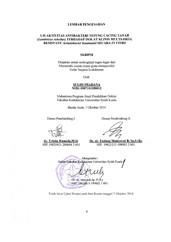 Sugih Pradana, UJI AKTIVITAS ANTIBAKTERI TEPUNG CACING TANAH (LUMBRICUS RUBELLUS) TERHADAP ISOLAT KLINIS MULTI-DRUG RESISTAN ACINETOBACTER BAUMANNII SECARA IN VITRO. Banda Aceh Fakultas Kedokteran,2014