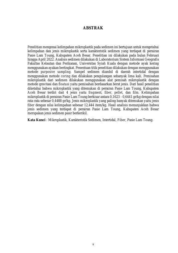 VEBYANA NOVI ERMANDA, KELIMPAHAN MIKROPLASTIK PADA SEDIMEN DI PERAIRAN PASIE LAM TOUNG, KABUPATEN ACEH BESAR. Banda Aceh Fakulta Kelautan dan Perikanan,2022