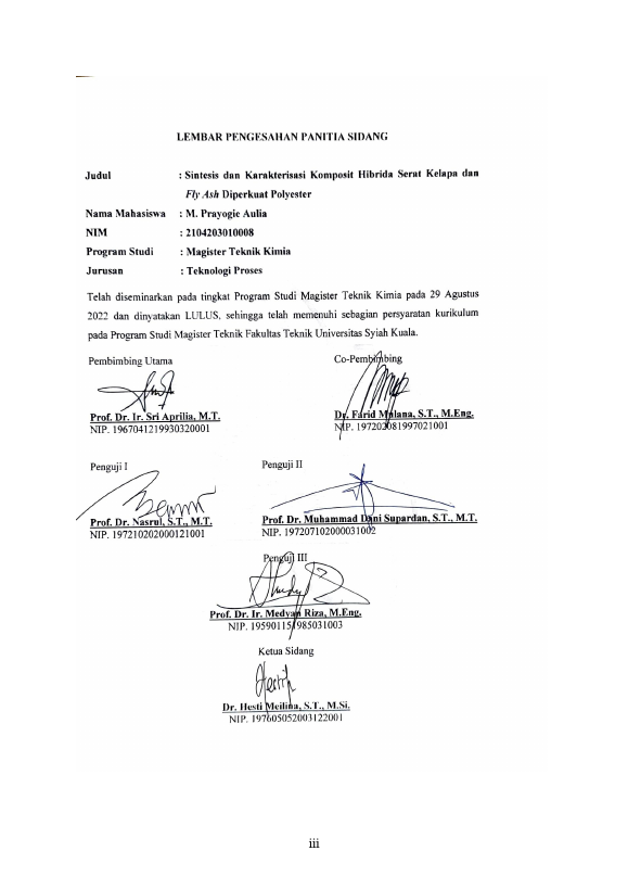 M. Prayogie Aulia, SINTESIS DAN KARAKTERISASI KOMPOSIT HIBRIDA SERAT KELAPA DAN FLY ASH DIPERKUAT POLYESTER. Banda Aceh Fakultas Teknik (S2),2022