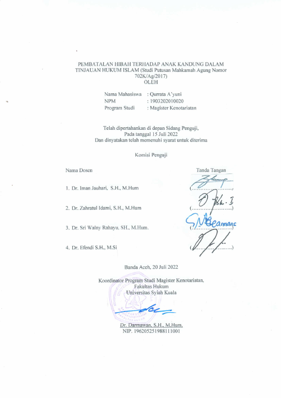 Baca Juga : STUDI KASUS PUTUSAN MAHKAMAH SYARIAH ACEH NOMOR 55/PDT.G/2012/MS-ACEH TENTANG PEMBATALAN HIBAH KEPADA ANAK ANGKAT (YASMEEN AZKIYA, 2016)