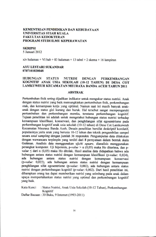 Ayu Lestari Sukandar, HUBUNGAN STATUS NUTRISI DENGAN PERKEMBANGANRNKOGNITIF ANAK USIA SEKOLAH (10-12 TAHUN) PADA KELUARGA DI DESA COT LAMKUWEUH KECAMATAN MEURAXA BANDA ACEH TAHUN 2011. Banda Aceh Fakultas Kedokteran,2012