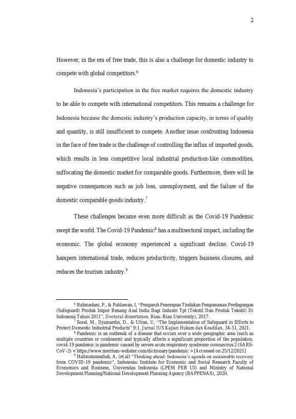 IZZAH MUJAHIDAH, THE PROTECTION OF THE INDONESIAN INDUSTRIES FROM SURGE OF IMPORTED GOODS DURING COVID-19 PANDEMIC. Banda Aceh FakultasHukum,2022