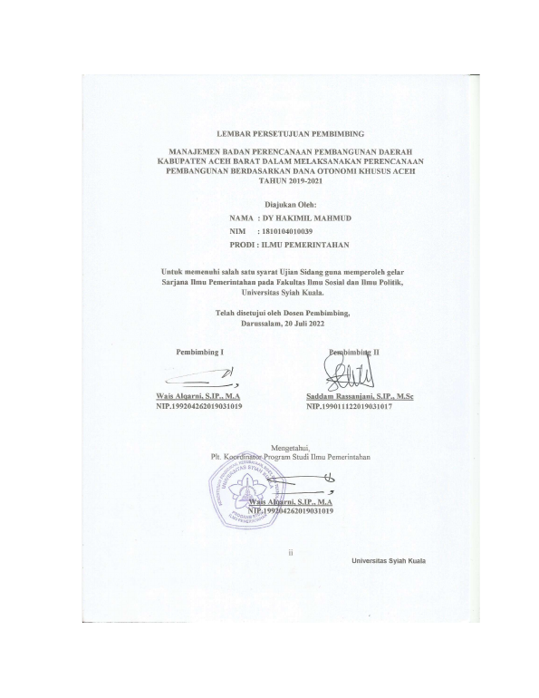 DY HAKIMIL MAHMUD, MANAJEMEN BADAN PERENCANAAN PEMBANGUNAN DAERAH KANUPATEN ACEH BARAT DALAM MELAKSANAKAN PERENCANAAN PEMBANGUNAN BERDASARKAN DANA OTONOMI KHUSUS ACEH TAHUN 2019-2021. Banda Aceh Fakultas Ilmu Sosial dan Ilmu Politik,2022