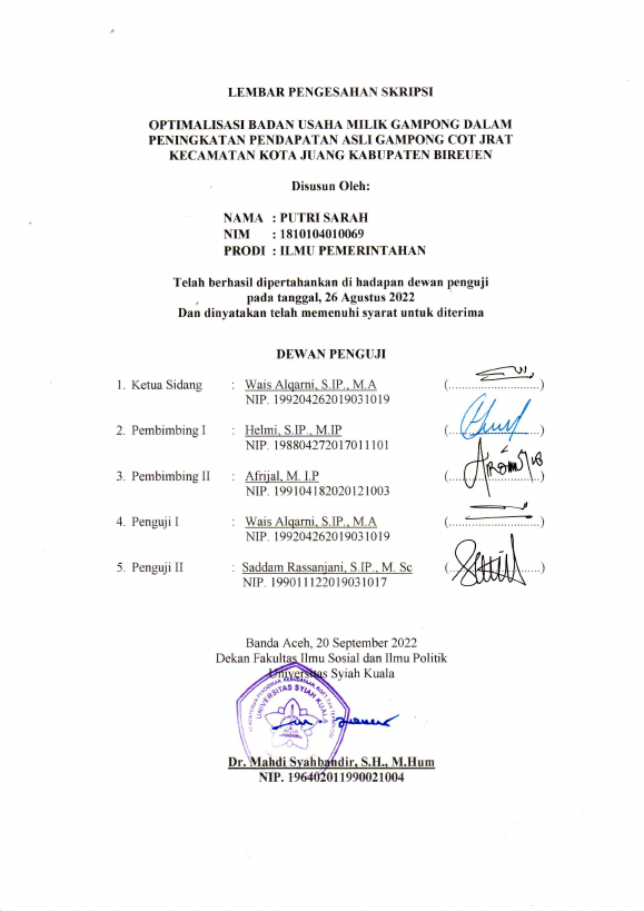 Baca Juga : OPTIMALISASI KINERJA BADAN USAHA MILIK GAMPONG MITRA MANDIRI DALAM MENINGKATKAN PENDAPATAN ASLI GAMPONG BAKCIRIH KECAMATAN MONTASIK KABUPATEN ACEH BESAR (FAUZAN, 2025)