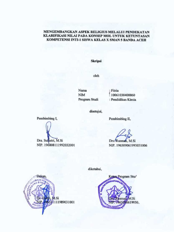 Fitria, MENGEMBANGKAN ASPEK RELIGIUS MELALUI PENDEKATAN KLARIFIKASI NILAI PADA KONSEP MOL UNTUK KETUNTASAN KOMPETENSI INTI-1 SISWA KELAS X SMAN 5 BANDA ACEH. Banda Aceh Fakultas Keguruan dan Ilmu Pendidikan,2014