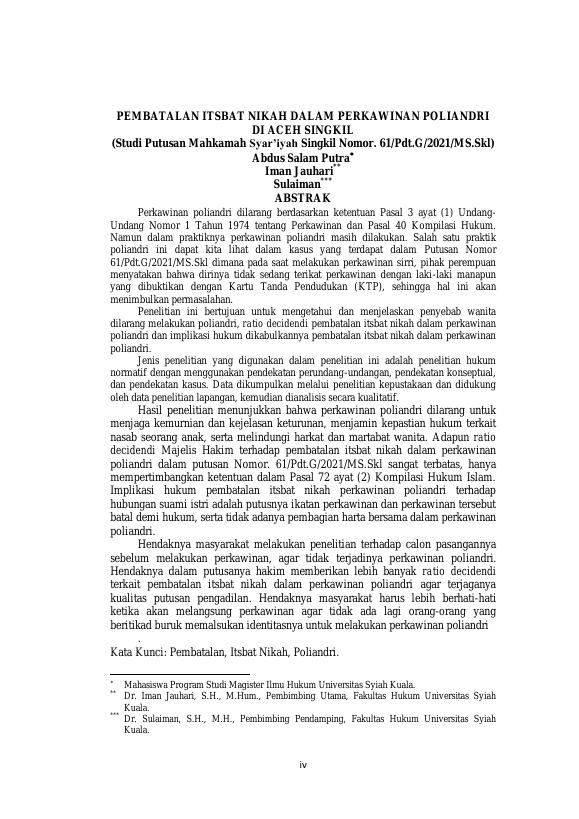 Abdus Salam Putra, PEMBATALAN ITSBAT NIKAH DALAM PERKAWINAN POLIANDRI DI ACEH SINGKIL (STUDI PUTUSAN MAHKAMAH SYAR’IYAH SINGKIL NOMOR 61/PDT.G/2021/MS.SKL). Banda Aceh Program Studi Magister Hukum,2022