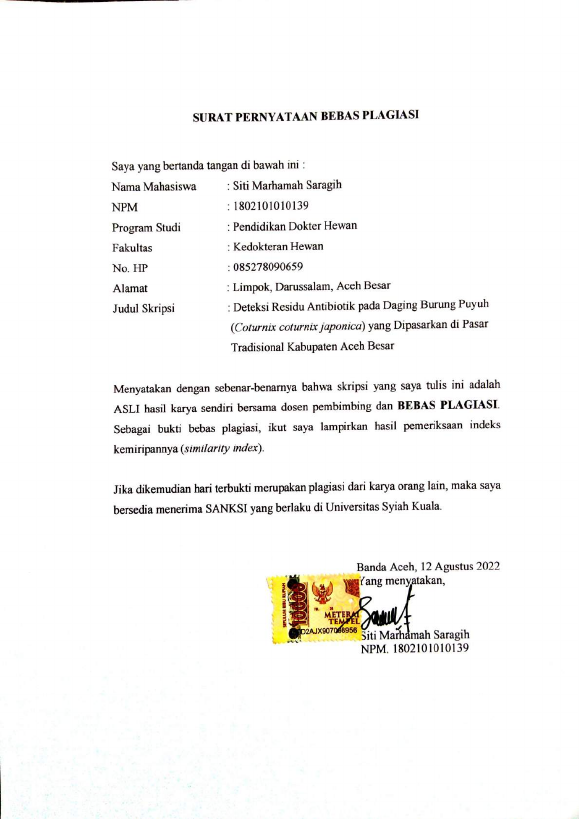 Baca Juga : DETEKSI RESIDU ANTIBIOTIK PADA DAGING BURUNG PUYUH (COTURNIX COTURNIX JAPONICA) YANG DIPASARKAN DI PASAR TRADISIONAL KABUPATEN ACEH BESAR (SITI MARHAMAH SARAGIH, 2022)