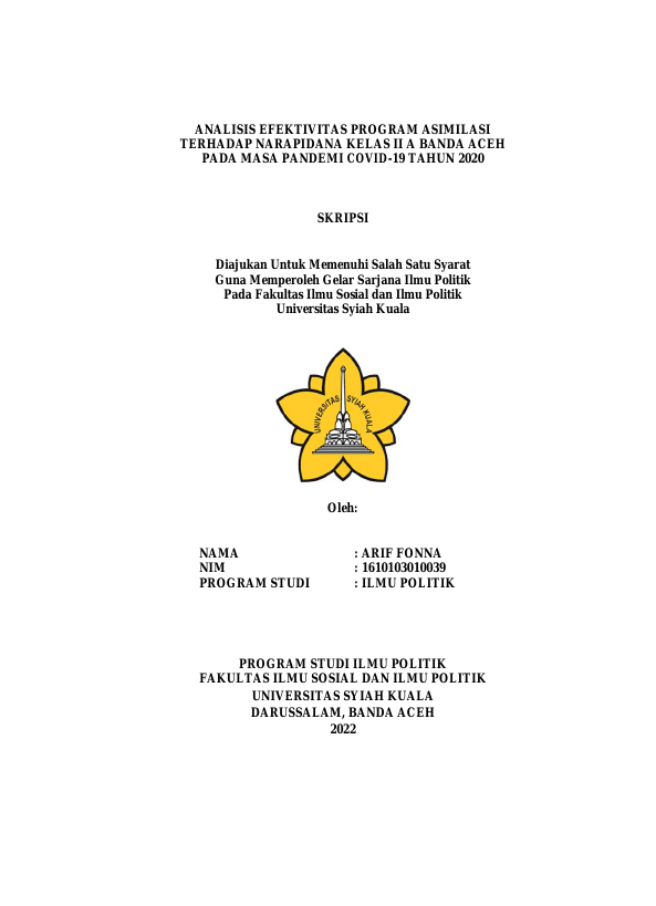 ARIF FONNA, ANALISIS EFEKTIVITAS PROGRAM ASIMILASI TERHADAP NARAPIDANA KELAS II A BANDA ACEH PADA MASA PANDEMI COVID-19 TAHUN 2020. Banda Aceh Fakultas Ilmu Sosial dan Ilmu Politik,2022